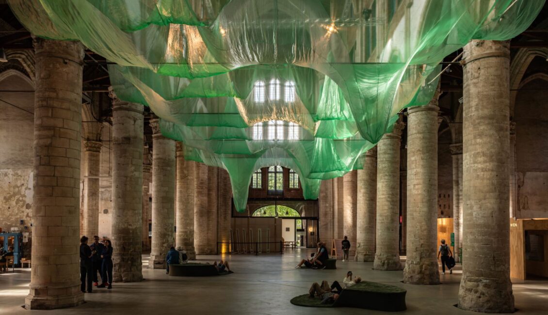 Voor Kerkmeester #4 transformeert de Grote Kerk Veere in een traag ademend onderwaterlandschap. In het midden van het werk hangt een lichtgewicht, bewegend textiel-sculptuur dat zachtjes golft – alsof je je in een onderwaterbos begeeft.