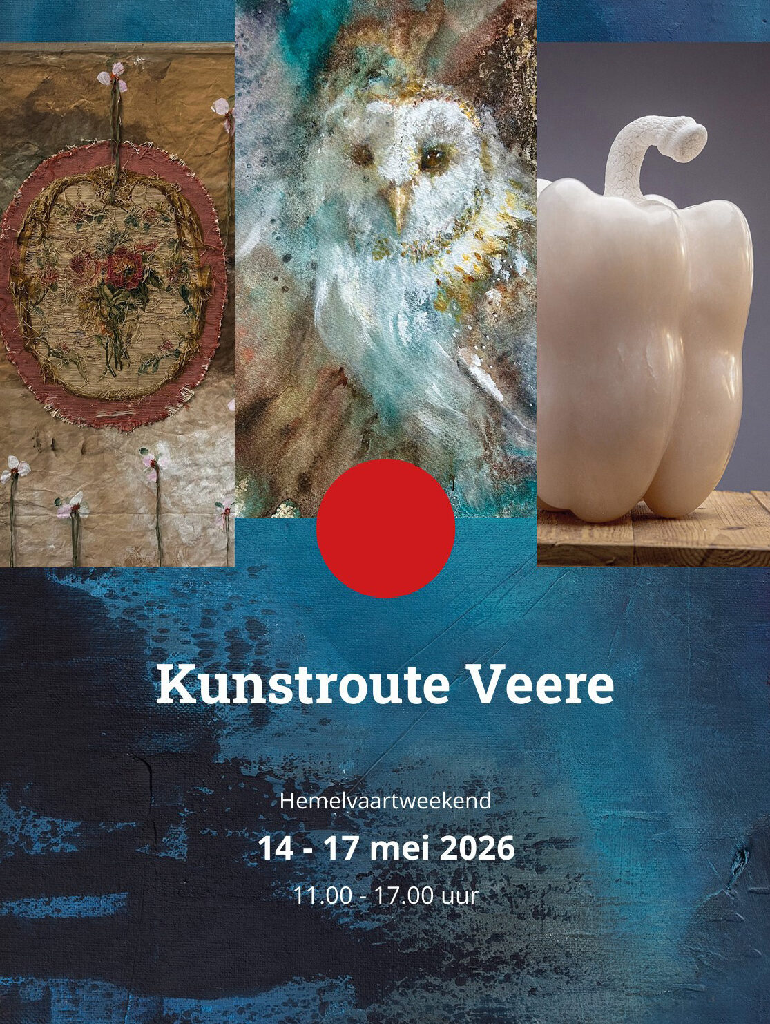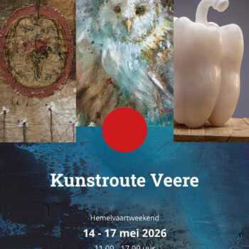 Elk jaar organiseert KiV (Kunst in Veere) een kunstroute met gastexposanten. Een mooie reeks van authenticiteit, verbeeldingskracht en vakmanschap wacht op u van donderdag 14 t/m zondag 17 mei 2026. De exposanten tonen hun werk op tal van sfeervolle locaties buiten en binnen. De locaties zijn te herkennen aan de rode bal, klapbord of vlag met rode stip.